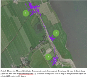 Door de zenders krijgen we steeds meer en beter inzicht. Dat grutto’s in een relatief korte periode met hun pullen zulke grote afstanden afleggen en daarbij “harde barrières” zoals wegen en dijken nemen. is bij velen vast niet bekend. Dit kan gevolgen hebben voor tellingen, zoals de broedsucces (BTS) tellingen. Bij deze tellingen wordt aangenomen dat grutto’s ‘harde barrières’ nauwelijks oversteken. Maar dit verhaal laat zien dat die barrières mogelijk minder hard zijn dan aangenomen, en dat in- en uitloop wel degelijk aan de orde kan zijn. Ter illustratie: deze twee gezenderde grutto’s hebben met hun pullen drie polders bezocht en twee BTS-telgebieden. Voor mij was dat in ieder geval een mooie ‘eyeopener’.